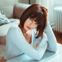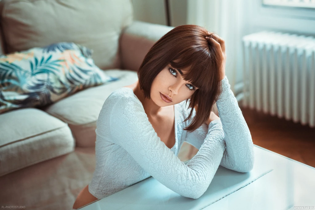 short hair and is wearing what appears to be a white top or blouse that matches the color of the room's decor. The background features a cozy