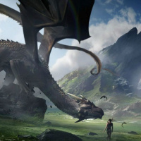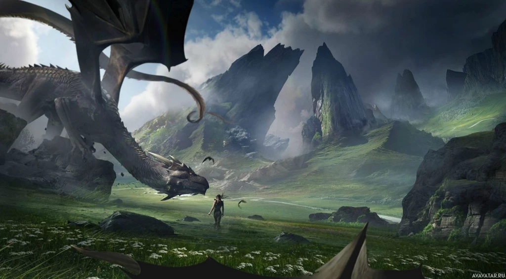a fantasy scene featuring a dragon and what appears to be an adventurer. The setting is a lush, green valley with rocky formations and waterfalls in the background, suggesting a serene yet rugged landscape typical of