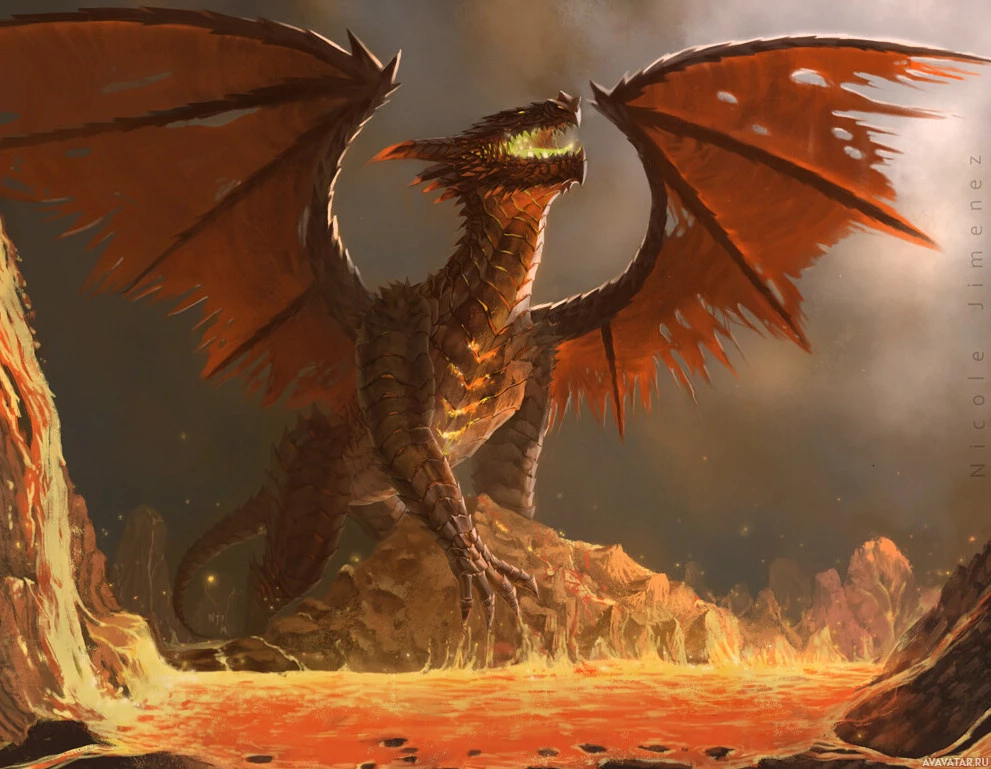 red scales, fiery eyes, and is standing in what appears to be a volcanic or lava-filled environment. It seems to be either roaring or breathing out fire into the surroundings. The setting suggests a dramatic, possibly apocalyptic, scenario with