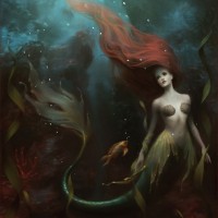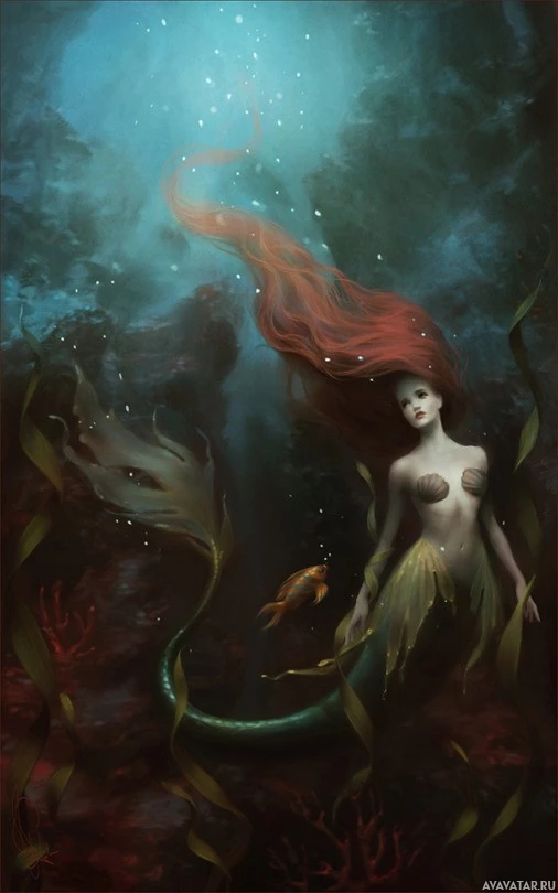 The image shows a fantasy-themed artwork featuring a red-haired mermaid. The mermaid has long flowing hair and is depicted with a tail, typically associated with