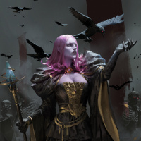 magical power or a wand. Her right arm is raised as if casting a spell, and there are crows flying around her, adding to