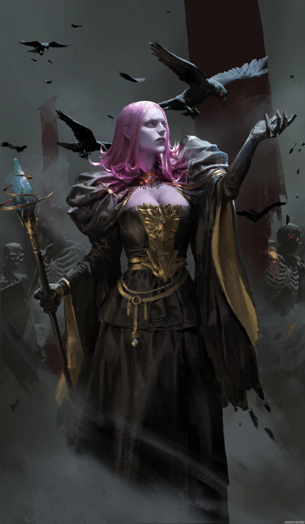 pink hair and is wearing a dark, regal-looking costume that suggests she might be a witch or sorceress. In her left hand, she holds what appears to be a staff with a glowing crystal at the top, which could symbolize