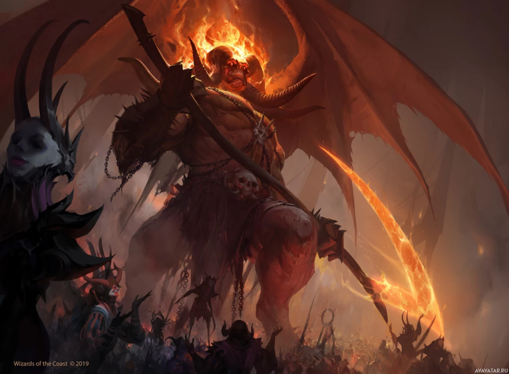 a fantasy scene with a prominent figure that resembles a demonic creature or warrior. This figure is holding a staff and appears to be commanding an army or leading some sort of infernal legion, as suggested by