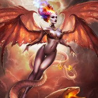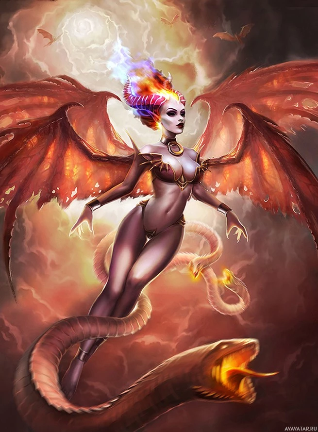 a fantasy creature often referred to as a succubus. This character is depicted with wings, a tail, and horns, suggesting she is from a mythical or fantastical realm. She has dark skin, pointed ears, and prominent features such as