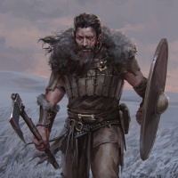 a cold environment, and carrying what seems to be a sword and shield, indicating they might be a warrior or warlord. The background features a landscape with a sky transitioning into the colors of either dawn or dusk, which could imply that this scene takes place early in the morning or late in the afternoon.
