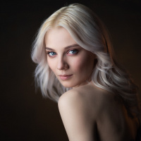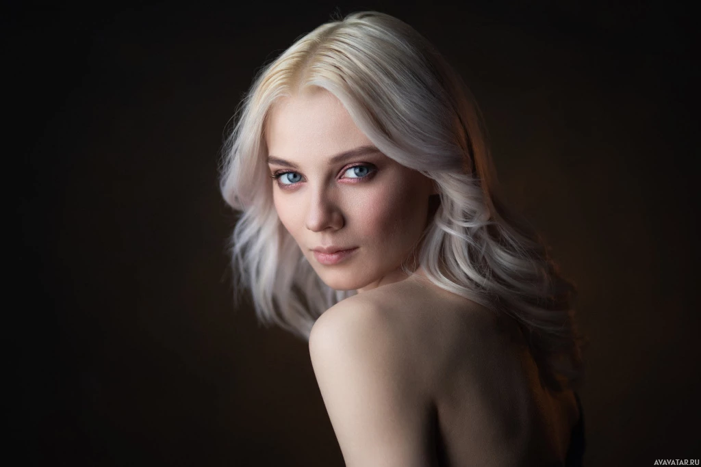 На картинке изображена женщина с белыми волосами и светлой кожей. У нее утонченная внешность, и она смотрит в сторону с едва заметной улыбкой на лице. Ее взгляд кажется задумчивым, что придает фотографии интроспективный характер.