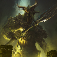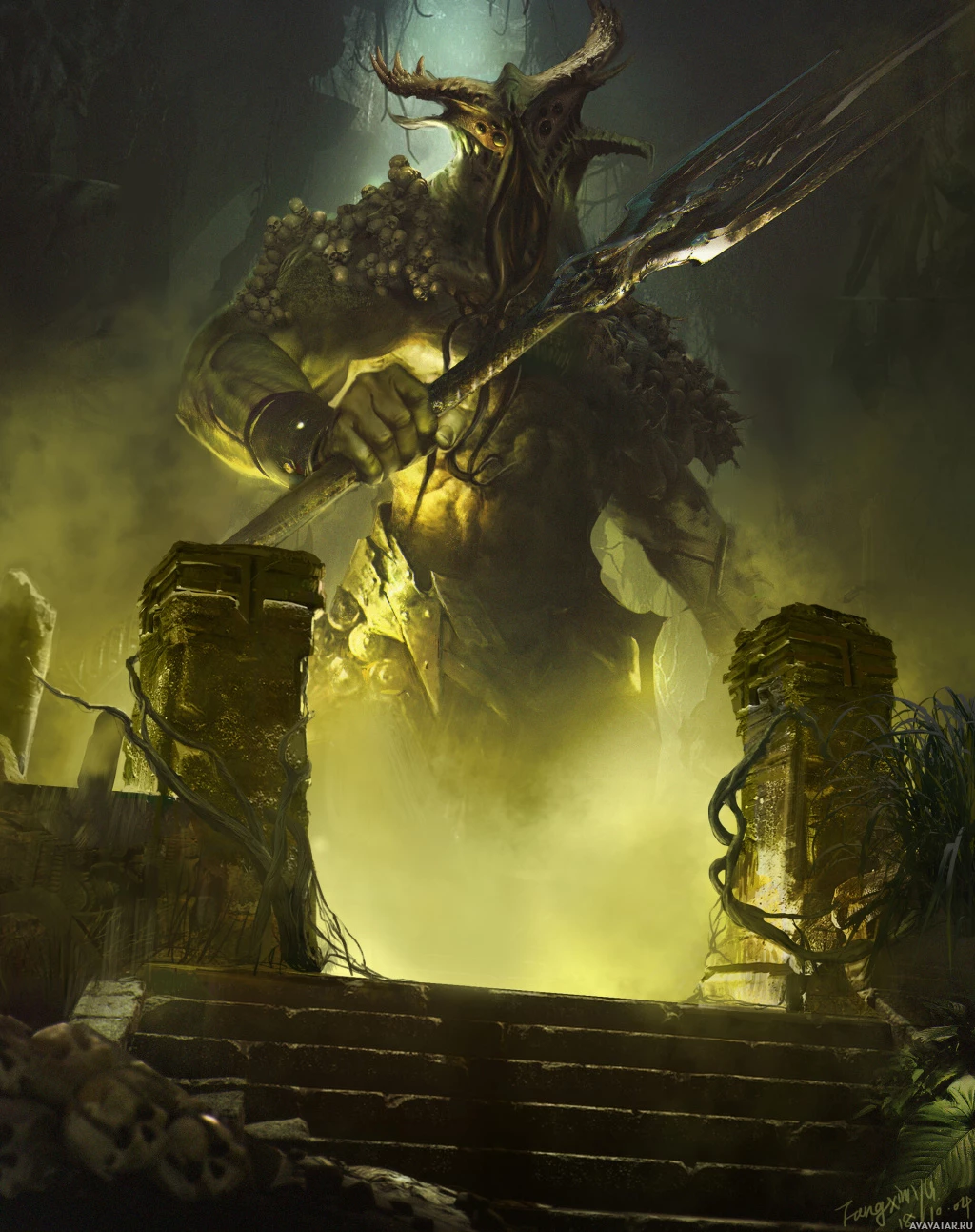a monstrous creature. This creature is standing in the center of the frame, holding what appears to be a staff or weapon in its right hand and raising its left arm as if ready for combat. It has an imposing stature with large horns on its head and