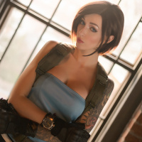 a serious expression on her face. Her hair is short, and she has visible tattoos on her arms. The setting looks like an indoor area that might be part of a game or a movie scene due to the presence of a barred window in the background, which suggests a location designed for
