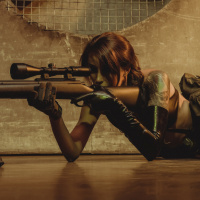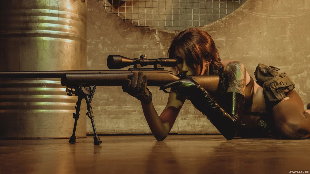 a sniper rifle and appear to be crouched or kneeling behind it, aiming or preparing to fire. The setting suggests an industrial or warehouse-like environment with