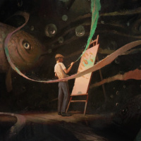 a sense of mystery and the creative process, as the man seems engrossed in his work on this fantastical subject.