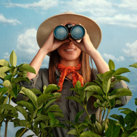 brimmed hat and an orange scarf around the neck. She is holding binoculars and appears to be peering through them with one hand raised in front of her face, as if she's observing something through the lenses. The individual has a smile on their face, indicating they might be enjoying what they are seeing or doing. There's greenery visible in the foreground, suggesting she may be outside near plants or trees.