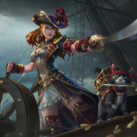 a tricorne hat and what seems to be a cape or cloak. There is also a cat next to her, which is wearing a similar outfit, suggesting they are part of the same crew. The setting includes the ship's wheel in the background, indicating that she might be at the helm, ready to steer the vessel.