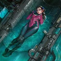 a female character who appears to be submerged in a liquid, possibly water or some kind of fluid. She is wearing a pink and black suit that seems to be designed for