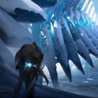 a video game or concept art. It shows a character standing on the edge of an icy landscape with frost and