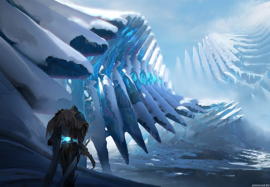 ice formations that resemble coral-like structures. In the background, there is a large creature with multiple wings that appears to be made out of ice or crystal elements, which could be interpreted as a mythical or magical creature from