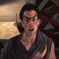 The image depicts a character who appears to be from the "Evil Dead"