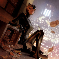 an urban environment, possibly inspired by Gotham City from the Batman series, indicated by the architecture in the background and the overall atmosphere.