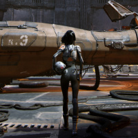 futuristic armor or gear and is equipped with a weapon that resembles an assault rifle. The environment around her suggests a technologically advanced area possibly within