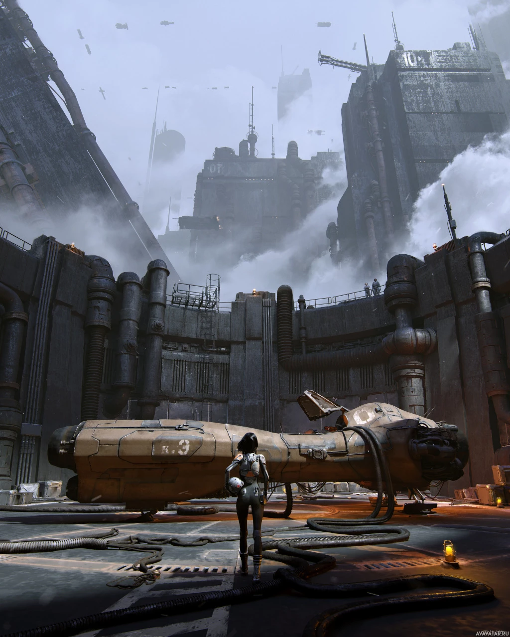 a space station or industrial facility, given the presence of pipes, machinery, and what looks like power generators or reactors in the background. There are also ships that appear to be part of the setting, hinting at the possibility of this being a space-faring adventure. The overall atmosphere is one of anticipation for an encounter or mission.
