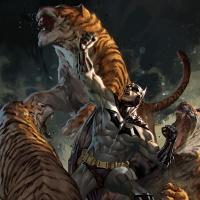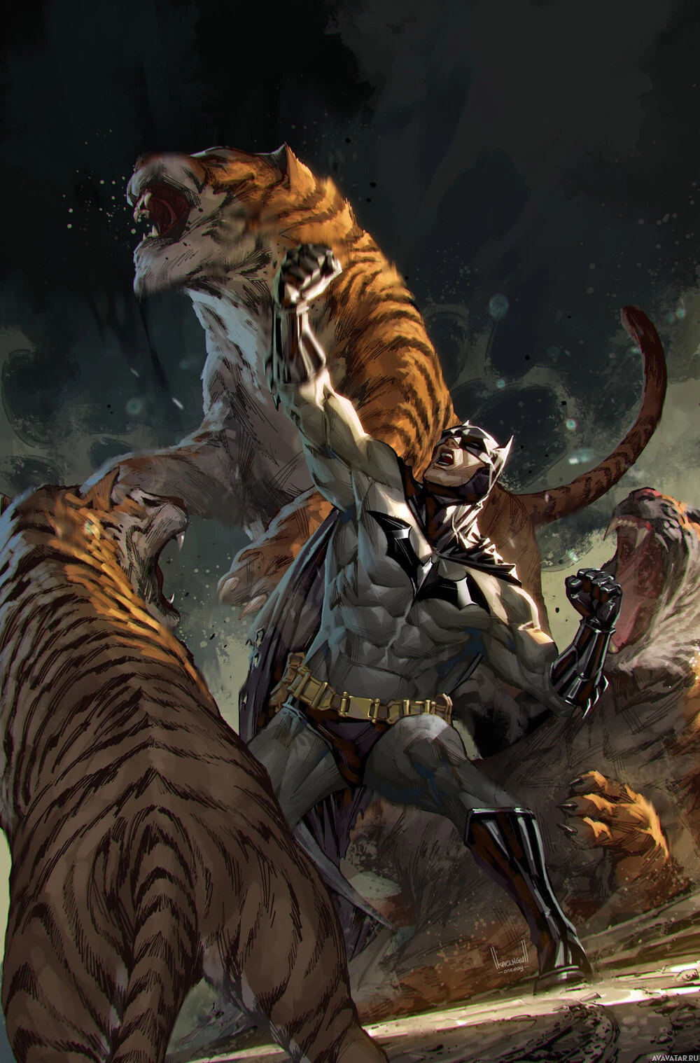 comic books published by DC Comics. In this particular artwork, Batman is shown facing off against two tigers. He appears to be using