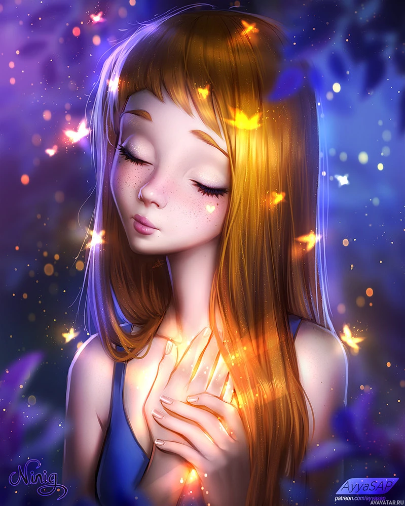 a state of relaxation or contemplation. There are whimsical elements around her such as stars and butterflies, suggesting a magical or dreamlike setting. The colors used are predominantly