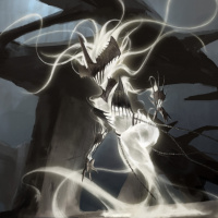 an ancient temple, with chains attached to the character's wrists. There are also some ghostly figures around the character and electrical sparks emanating from its hands, suggesting some sort of