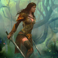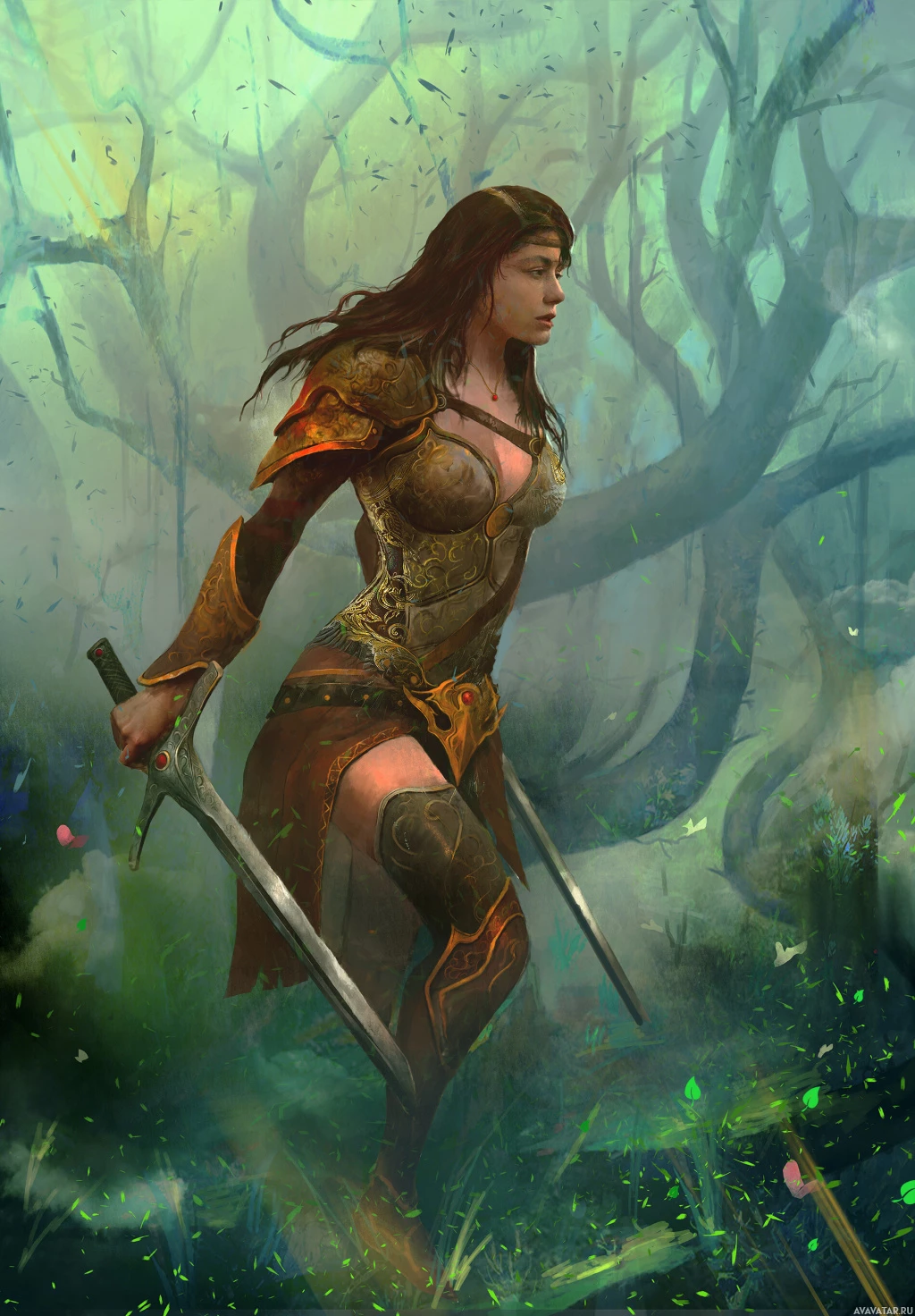 На картинке изображен персонаж женского пола, который, по-видимому, является персонажем из фантастического мира. Она одета в доспехи и держит меч, что наводит на мысль о том, что она может быть воином или истребителем. Ее поза указывает на то, что она находится в движении, возможно, идет или бежит по местности, похожей на лес или джунгли в условиях тумана. Выражение лица персонажа и язык его тела передают ощущение целеустремленности.