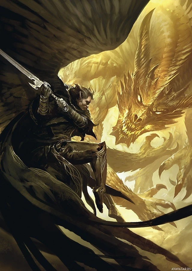 a fantasy scene featuring a warrior on horseback, wielding a sword and shield, facing an imposing dragon. The warrior is wearing armor with wings attached to the back, suggesting they might be an angelic or