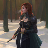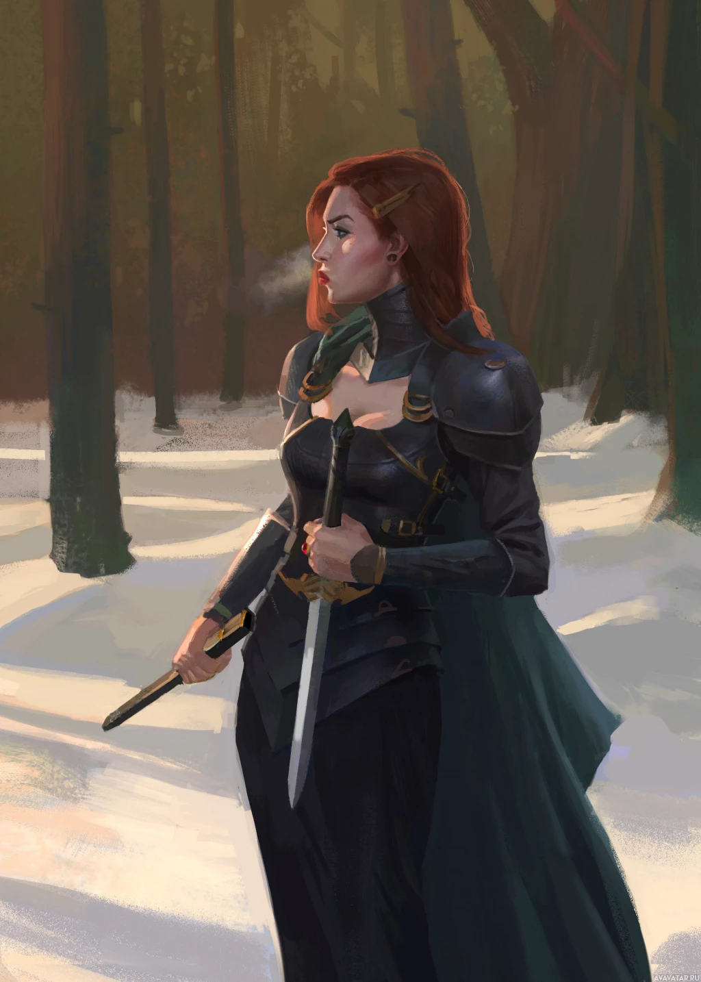 На картинке изображен персонаж женского пола с рыжими волосами, одетый в средневековые или фэнтезийные доспехи. Одна рука у нее на бедре, в другой она сжимает меч. Место действия - заснеженный лес или поляна с голыми деревьями, что наводит на мысль о холоде, возможно, зимнем.