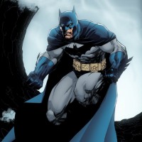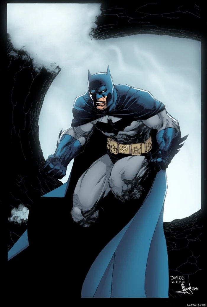 The image shows a character known as Batman. He is standing against a backdrop that suggests a nocturnal or gritty