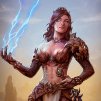 a lightning bolt emanating from her fingertips, suggesting she might be casting a spell or performing a magical action. She stands in an open landscape that appears to be a desert or arid plain, under