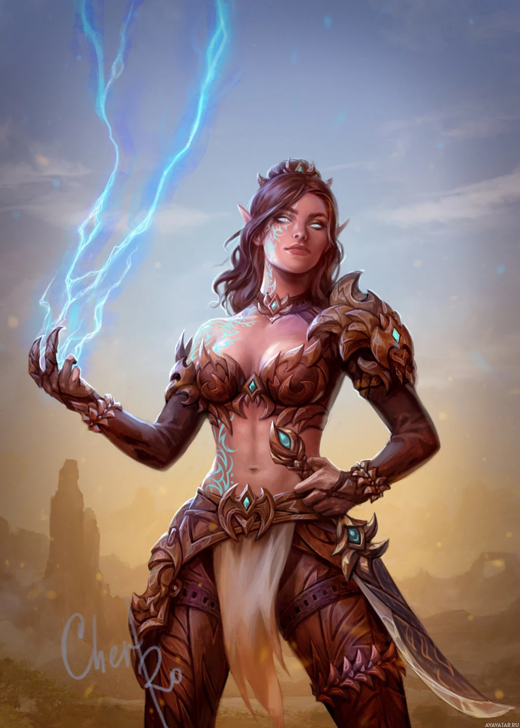 The image features a fantasy-themed character, an elf woman with short