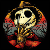 top hat and is dressed in a skeleton costume. Jack is holding a pair of scissors in one hand, which is a key element from the movie when he tries to cut down the tree. The background suggests a Halloween theme with a color scheme that includes orange, purple, and blue, common colors associated with