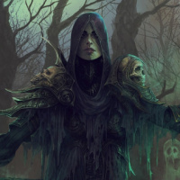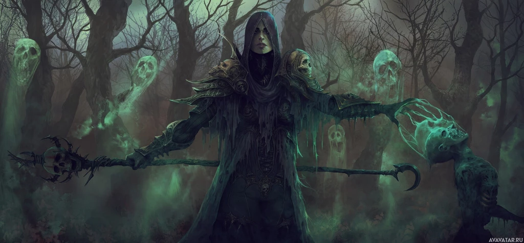 misty forest filled with ghostly apparitions that seem to be floating around them. The overall atmosphere suggests a mystical or supernatural setting typical of