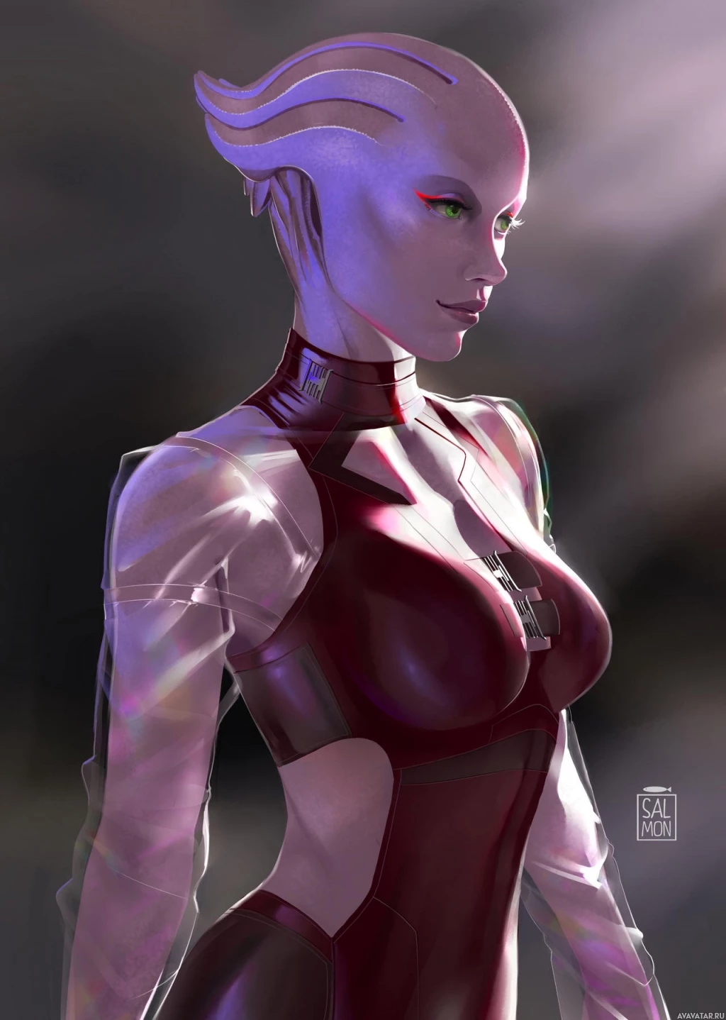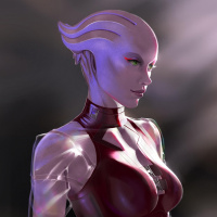 purple skin and horns, suggesting she may be of the Salarian species in the game's universe. She is wearing a suit that looks like a blend between armor and formal wear, which is consistent with the futuristic aesthetic typical of "