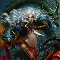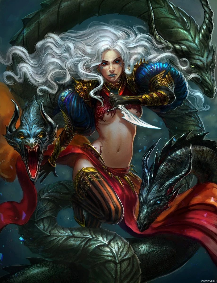 На картинке изображен персонаж женского фэнтези с белыми волосами. Она изображена в боевой позе, с мечом в руках и управляющей двумя драконами. Ее наряд включает доспехи, которые, по-видимому, выполнены в средневековом или фэнтезийном стиле. На заднем плане изображена ночная сцена со звездами, виднеющимися над ее головой.
