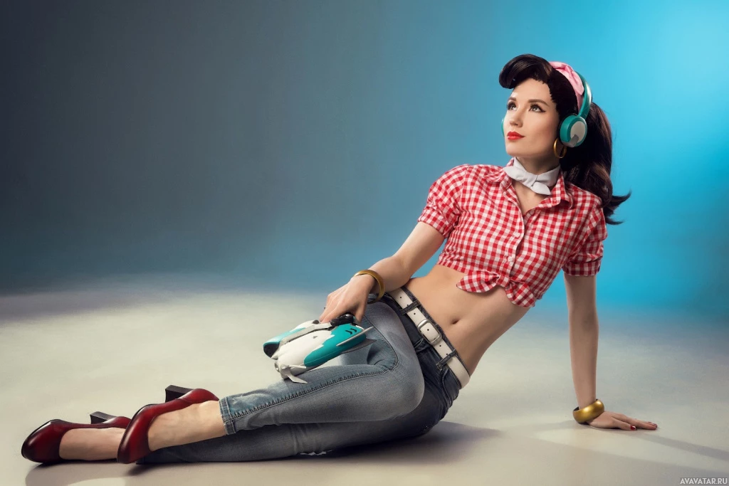 На картинке изображен человек, одетый как персонаж D.Va из видеоигры "Overwatch". В этом косплее присутствуют элементы, характерные для D.Va ее внешний вид в игре, например, клетчатая рубашка и наушники, которые являются частью фирменного образа ее персонажа.