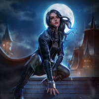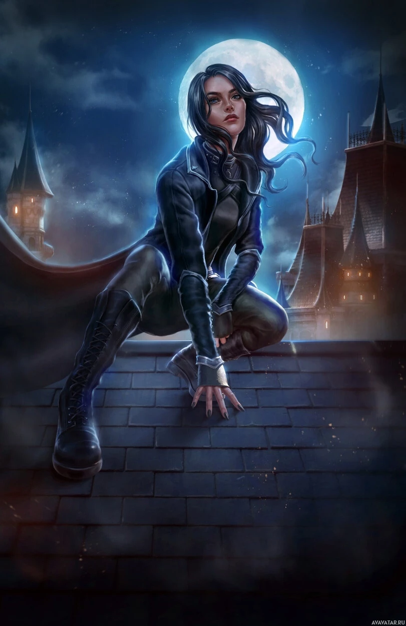 a female character who appears to be in a superhero costume, sitting on the edge of a roof under a full moon. She has