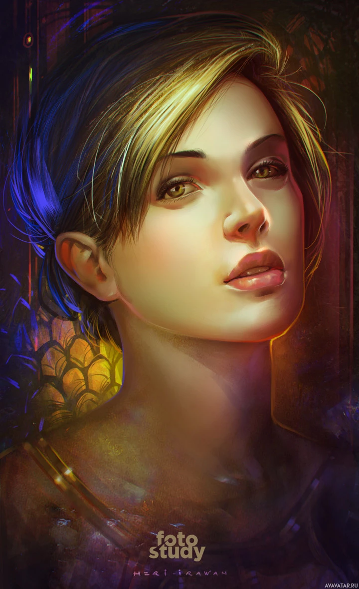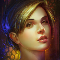 a touch of color, which adds depth to the portrayal. The background suggests a warm, possibly mystical or magical setting, with a hint of foliage in shades of green and yellow. This artwork demonstrates a high
