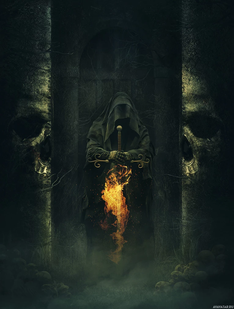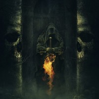 a fantasy scene with a character cloaked in shadow, holding a staff that appears to be casting fire. The character is standing in front of an archway or doorway, which has skulls as part of its decoration, suggesting a dark or