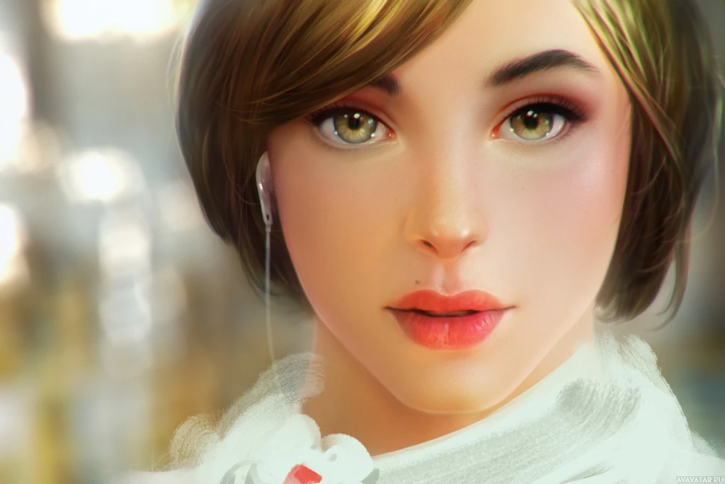 blonde hair, light eyes, and is wearing a white headband or accessory. Her makeup includes