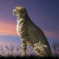 На картинке изображен гепард, стоящий на поросшем травой поле на фоне красивого заката. В небе летают птицы, что создает безмятежную атмосферу сцены.