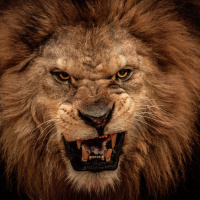 На картинке изображен лев с агрессивным выражением лица, демонстрирующий свои зубы и рычащий. Кажется, что он рычит или зевает с широко открытой пастью, демонстрируя мощь своих челюстей.