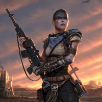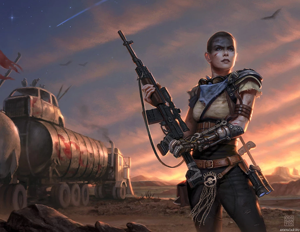 stripe pattern on it. Furiosa is holding a gun, which suggests she may be part of an action-