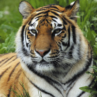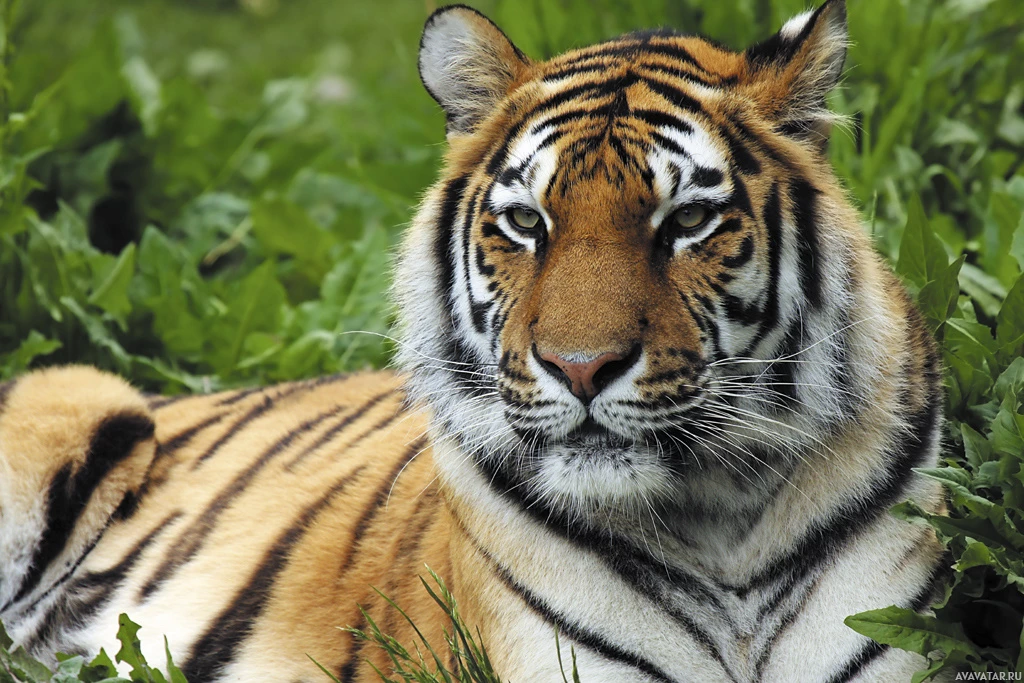 На снимке изображен тигр. Это взрослый тигр с мехом коричневых, черных и белых оттенков, характерных для этого вида. Тигр отдыхает на том, что в дикой природе выглядит как трава или невысокая растительность.