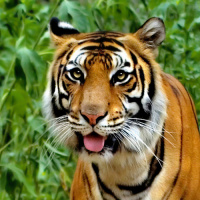 a natural setting, likely in its habitat. The tiger's fur looks well-groomed and it seems healthy. There are green plants and possibly some