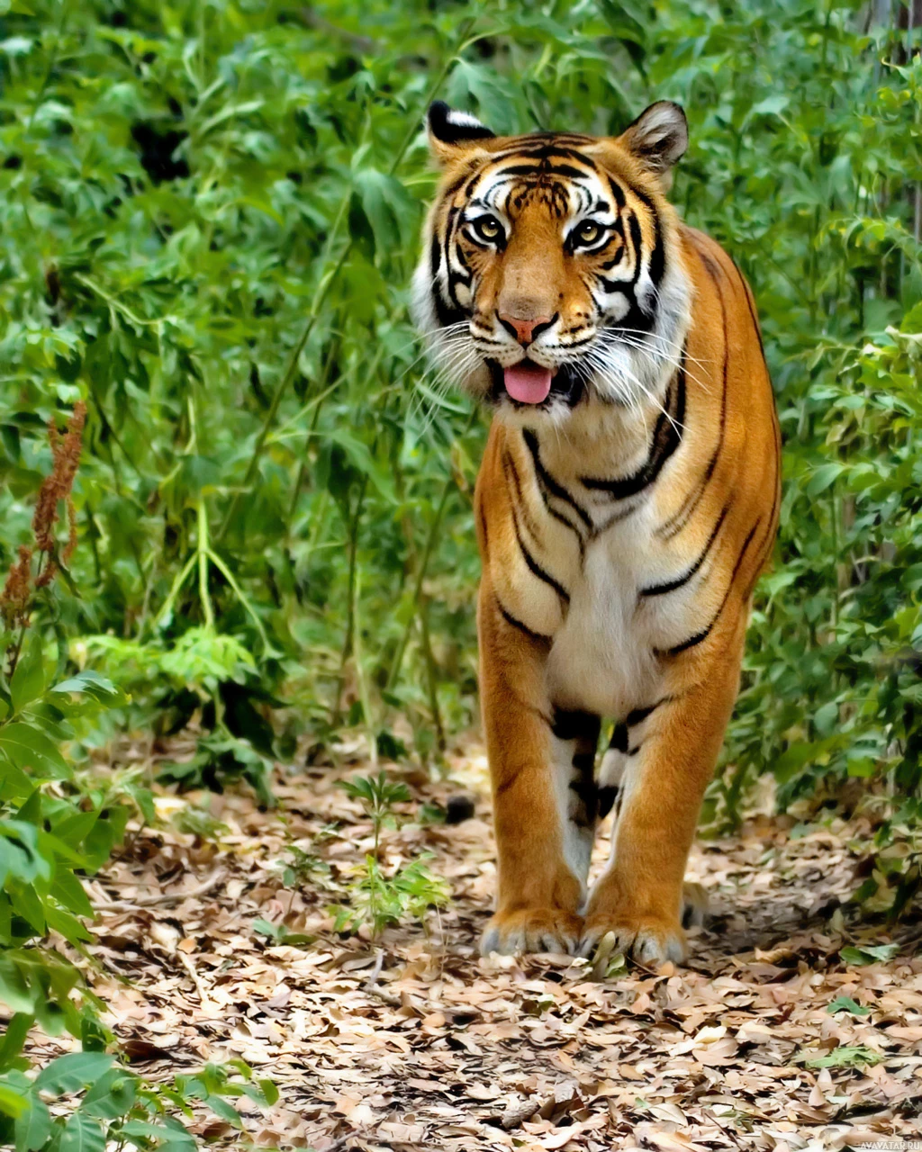 fallen leaves on the ground, indicating that this could be a jungle or forested area where wildlife such as tigers thrive.