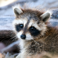 На фотографии изображен детеныш енота, которого часто называют котенком или львенком. Кажется, что он находится на открытом воздухе в окружении природы, возможно, в лесу или редколесье. У енота характерный коричневый мех, и он смотрит прямо в камеру, что придает ему любопытный и милый вид.