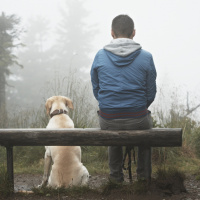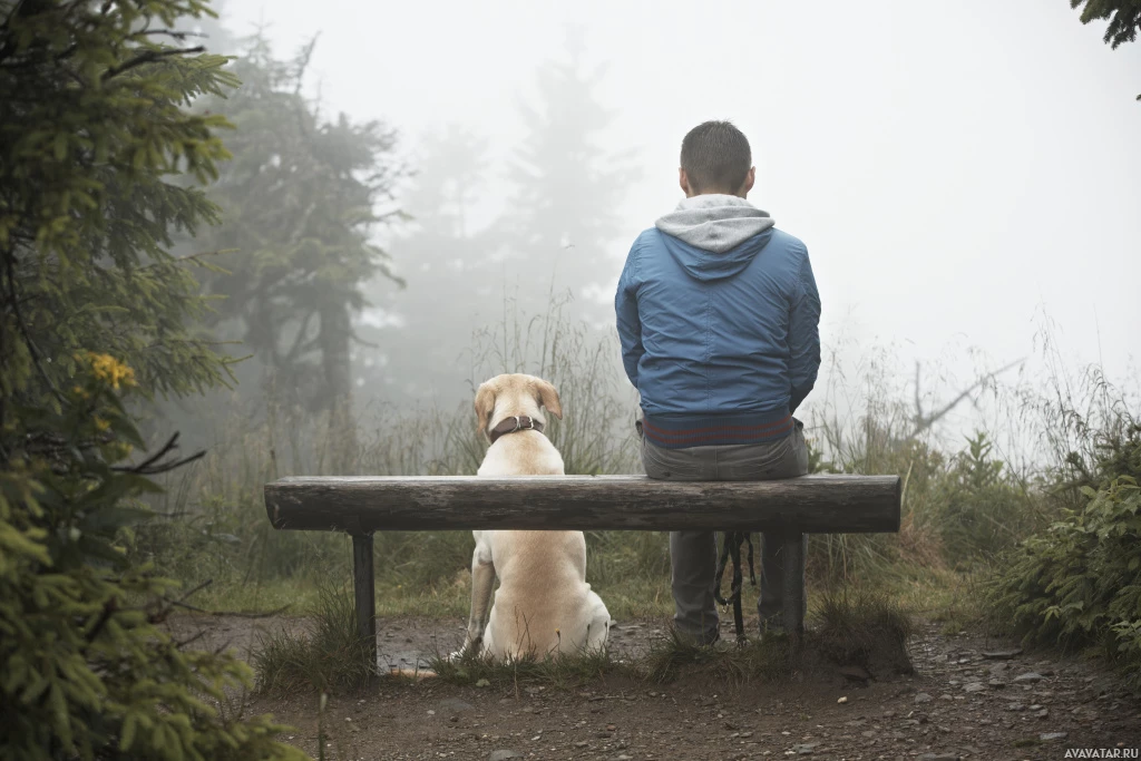The image shows a man sitting on a bench with his back to the camera, accompanied by a dog. Both are wearing rain gear, suggesting it might be raining or that they have been hiking in inclement