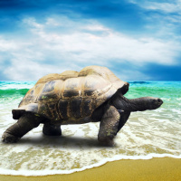 the ocean waves onto the beach. It appears to be a composite or digitally altered photo, as turtles typically don't walk on sand like humans do. The sky is dramatic with